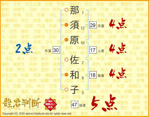 那(7画)須(12画)原(10画) 佐(7画)和(8画)子(3画)
