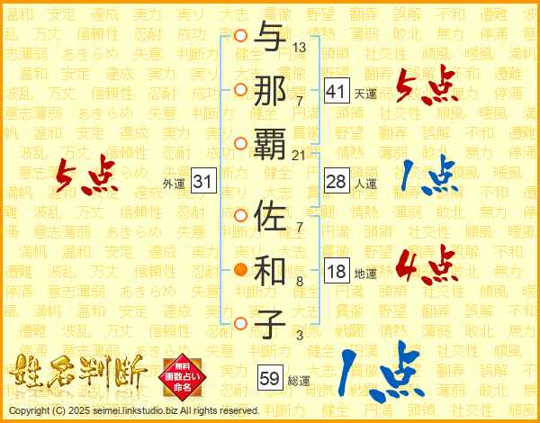 与(13画)那(7画)覇(21画) 佐(7画)和(8画)子(3画)