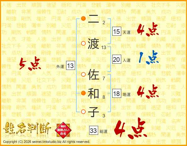 二(2画)渡(13画) 佐(7画)和(8画)子(3画)