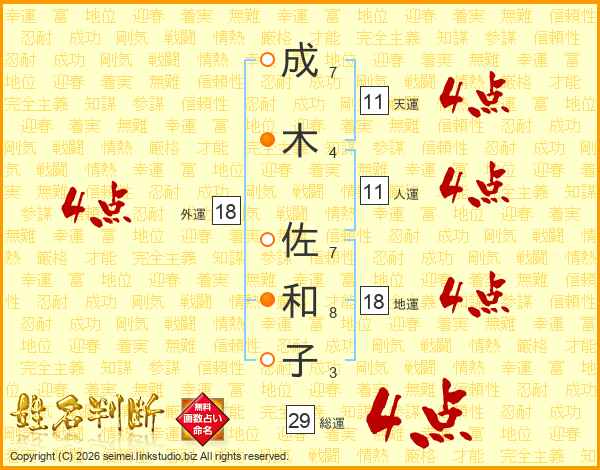 成(7画)木(4画) 佐(7画)和(8画)子(3画)