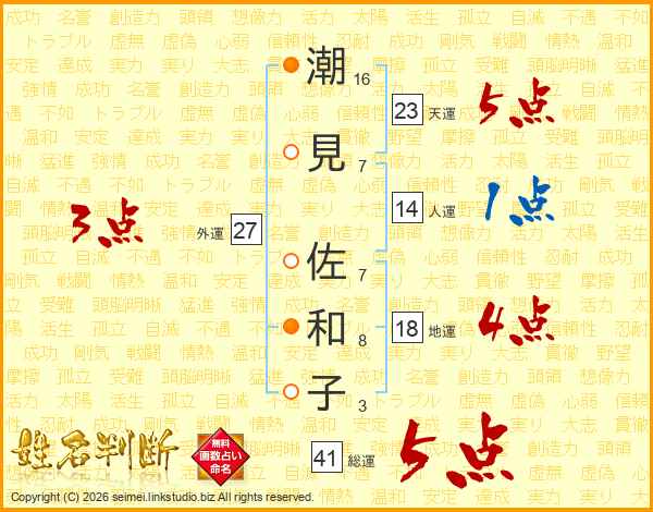 潮(16画)見(7画) 佐(7画)和(8画)子(3画)