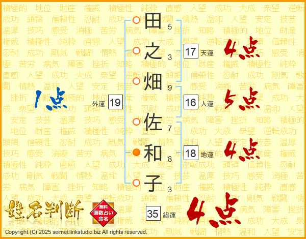 田(5画)之(3画)畑(9画)  佐(7画)和(8画)子(3画)