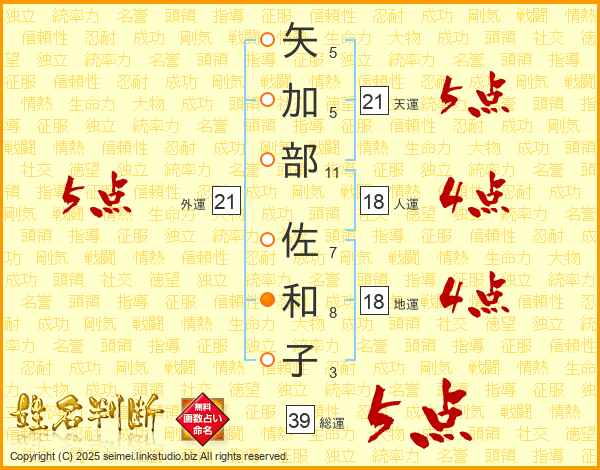 矢(5画)加(5画)部(11画) 佐(7画)和(8画)子(3画)