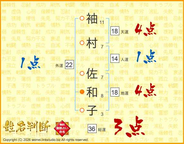 袖(11画)村(7画) 佐(7画)和(8画)子(3画)