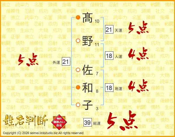 髙(10画)野(11画) 佐(7画)和(8画)子(3画)