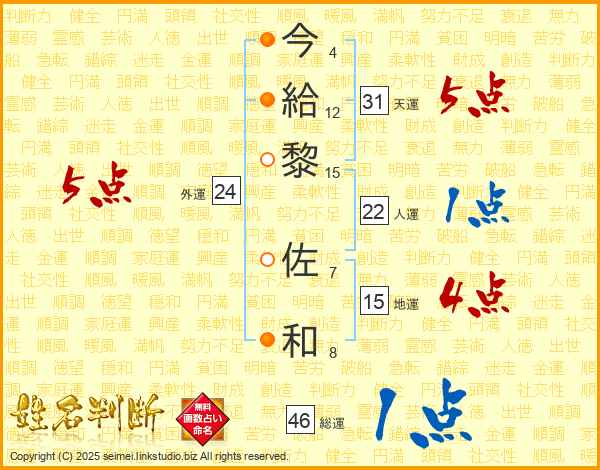 今(4画)給(12画)黎(15画) 佐(7画)和(8画)