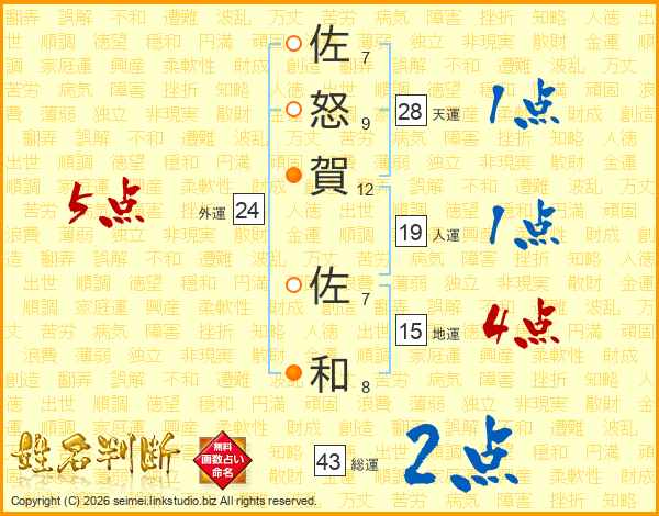 佐怒賀佐和さんの総運は43画の2点!