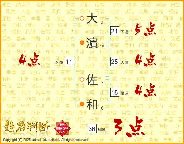 あなたの人生を表す1番重要な運勢です。生涯を通じて影響する総合運となり、主に50歳以降の晩年期に影響を及ぼします。苗字と名前の合計画数。