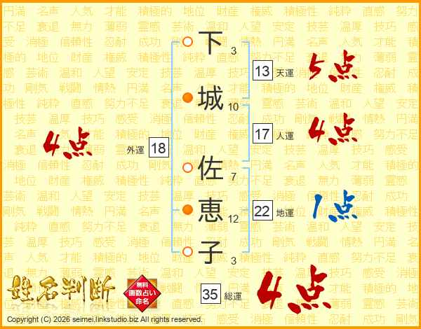下(3画)城(10画) 佐(7画)恵(12画)子(3画)