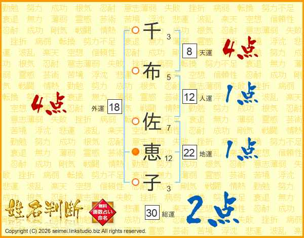 千(3画)布(5画) 佐(7画)恵(12画)子(3画)