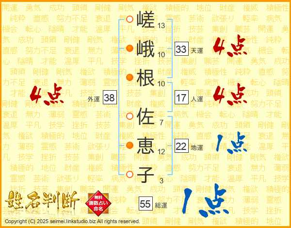 嵯(13画)峨(10画)根(10画) 佐(7画)恵(12画)子(3画)