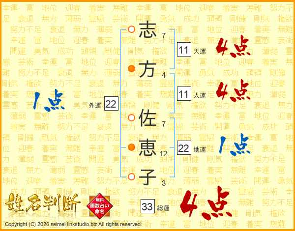 志(7画)方(4画) 佐(7画)恵(12画)子(3画)