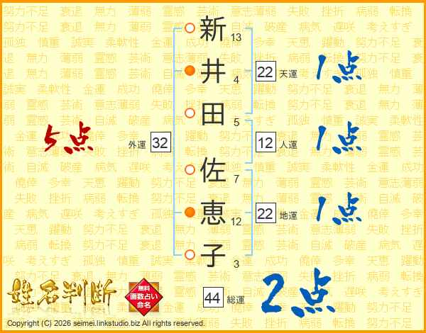 新(13画)井(4画)田(5画) 佐(7画)恵(12画)子(3画)