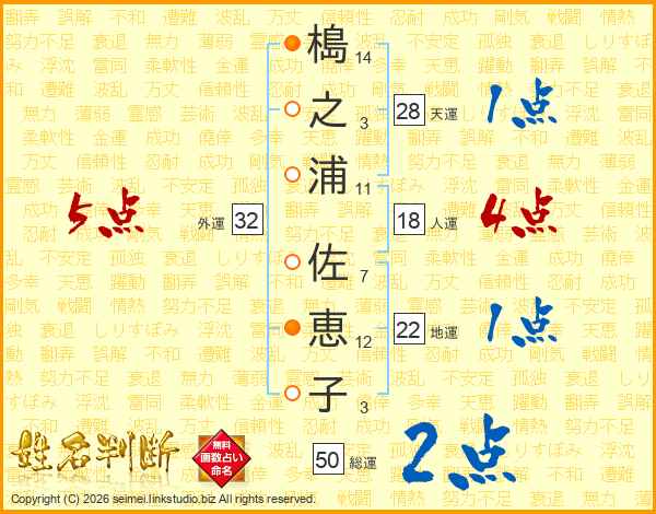 槝(14画)之(3画)浦(11画) 佐(7画)恵(12画)子(3画)