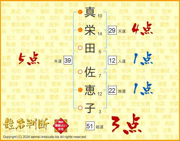 真(10画)栄(14画)田(5画) 佐(7画)恵(12画)子(3画)