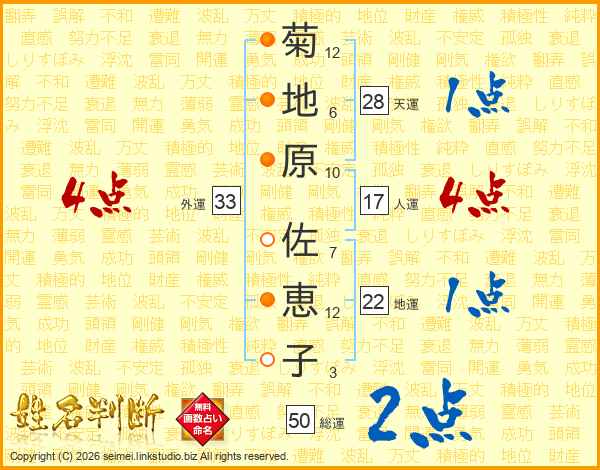 菊(12画)地(6画)原(10画) 佐(7画)恵(12画)子(3画)