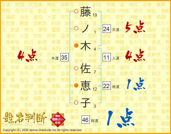 藤(19画)ノ(1画)木(4画) 佐(7画)恵(12画)子(3画)