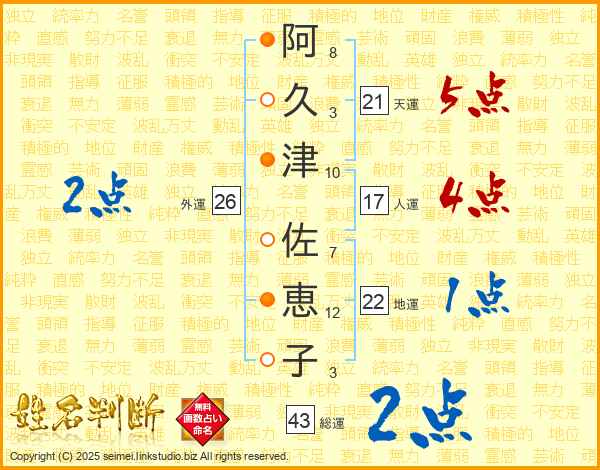 阿(8画)久(3画)津(10画) 佐(7画)恵(12画)子(3画)