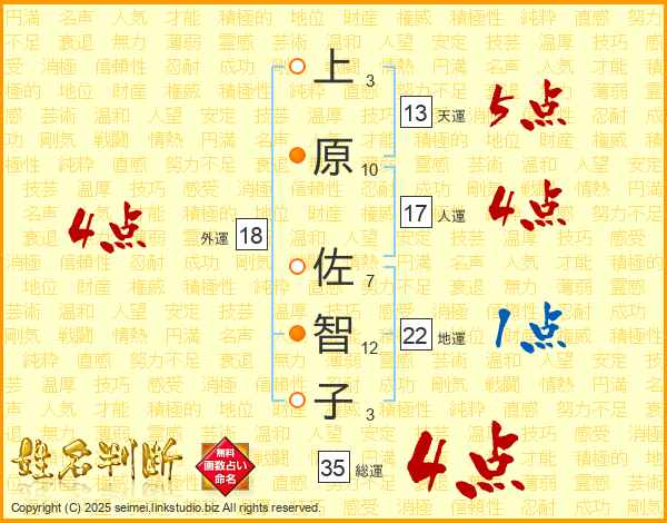上(3画)原(10画) 佐(7画)智(12画)子(3画)