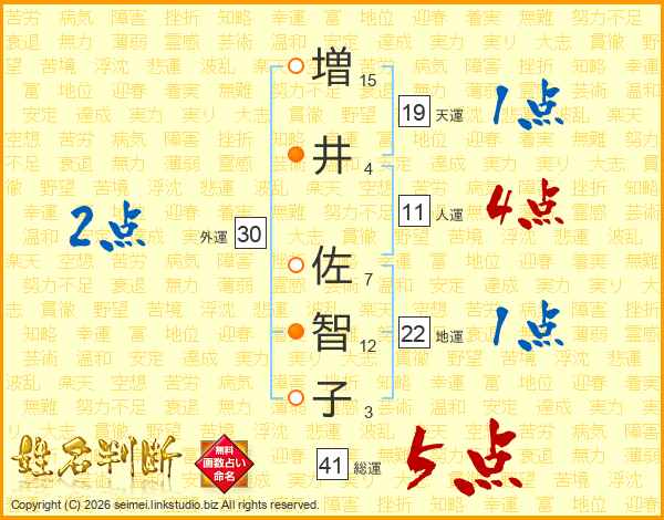 増(15画)井(4画) 佐(7画)智(12画)子(3画)