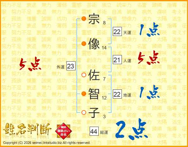 宗(8画)像(14画) 佐(7画)智(12画)子(3画)