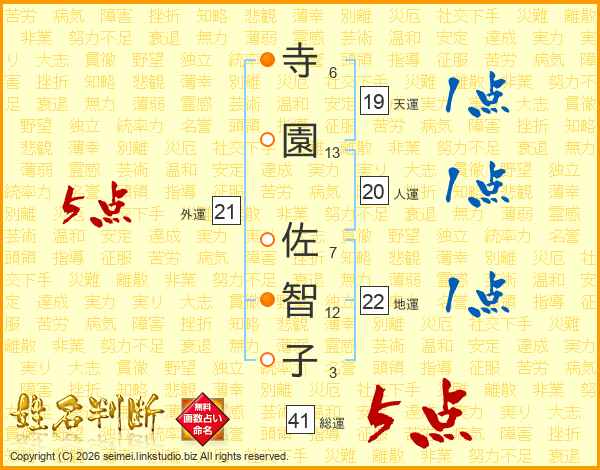 寺(6画)園(13画) 佐(7画)智(12画)子(3画)