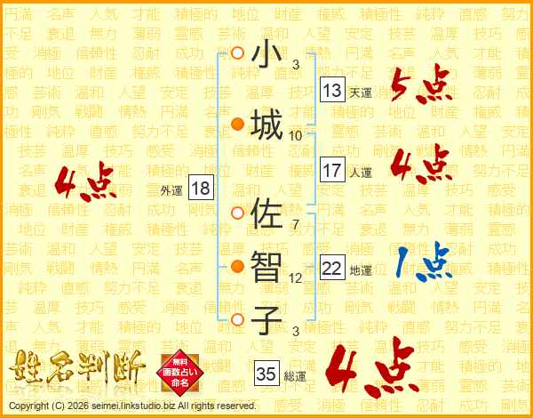 小(3画)城(10画) 佐(7画)智(12画)子(3画)