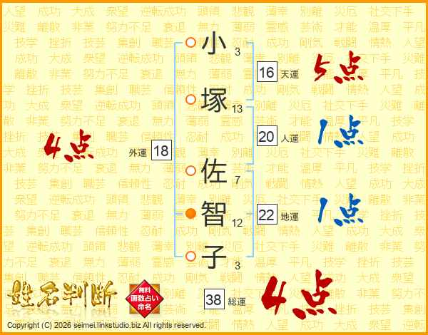 小(3画)塚(13画) 佐(7画)智(12画)子(3画)