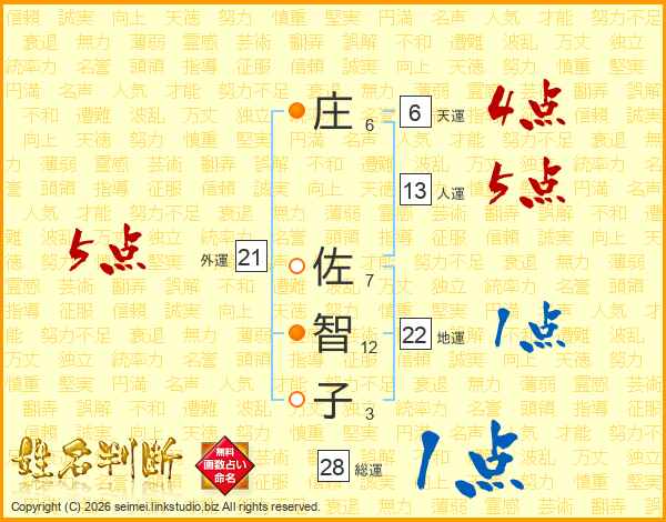 家系が持つ宿命的な運勢を表します。祖先から受け継いだ苗字ですので自分の力が及びません。家柄を象徴します。苗字の合計画数。