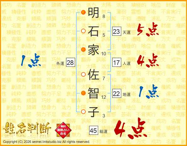 明(8画)石(5画)家(10画) 佐(7画)智(12画)子(3画)