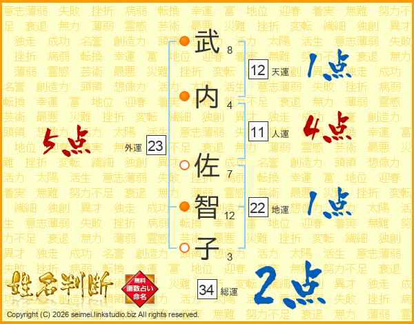 武(8画)内(4画) 佐(7画)智(12画)子(3画)