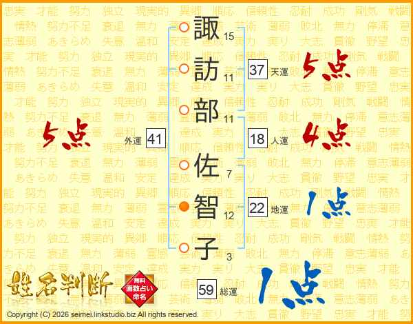 諏(15画)訪(11画)部(11画) 佐(7画)智(12画)子(3画)