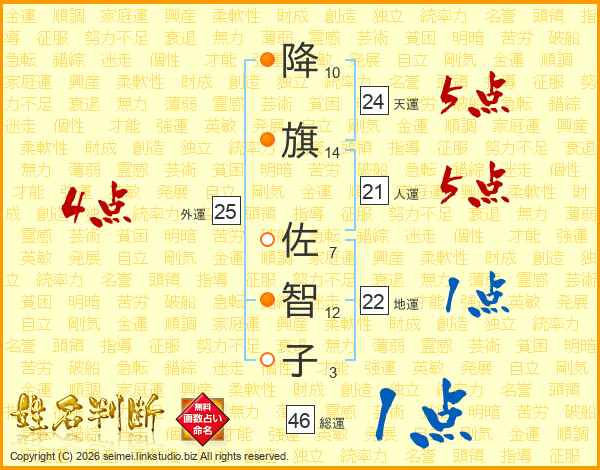 降(10画)旗(14画) 佐(7画)智(12画)子(3画)