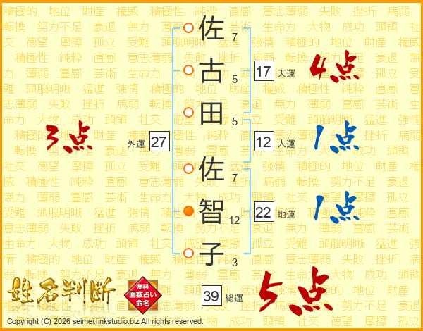 佐(7画)古(5画)田(5画) 佐(7画)智(12画)子(3画)