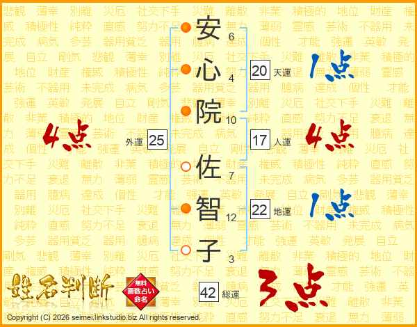 安(6画)心(4画)院(10画) 佐(7画)智(12画)子(3画)