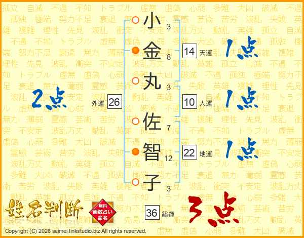 小(3画)金(8画)丸(3画) 佐(7画)智(12画)子(3画)