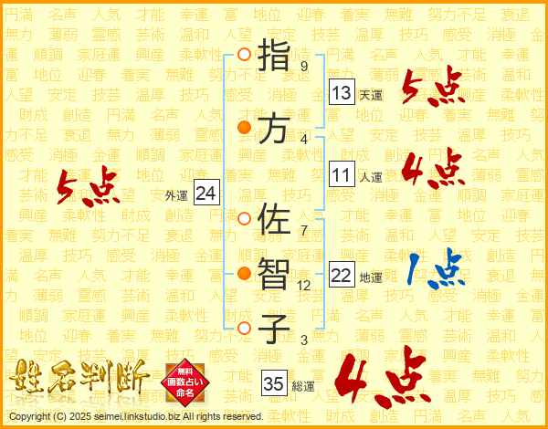 指(9画)方(4画) 佐(7画)智(12画)子(3画)