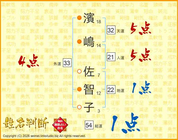 濱(18画)嶋(14画) 佐(7画)智(12画)子(3画)