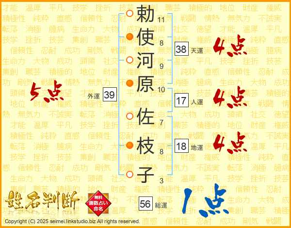 勅(11画)使(8画)河(9画)原(10画) 佐(7画)枝(8画)子(3画)