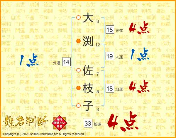 大(3画)渕(12画) 佐(7画)枝(8画)子(3画)