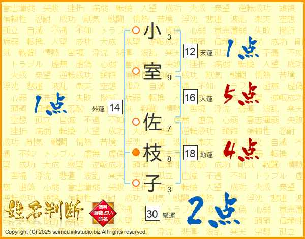 小(3画)室(9画) 佐(7画)枝(8画)子(3画)