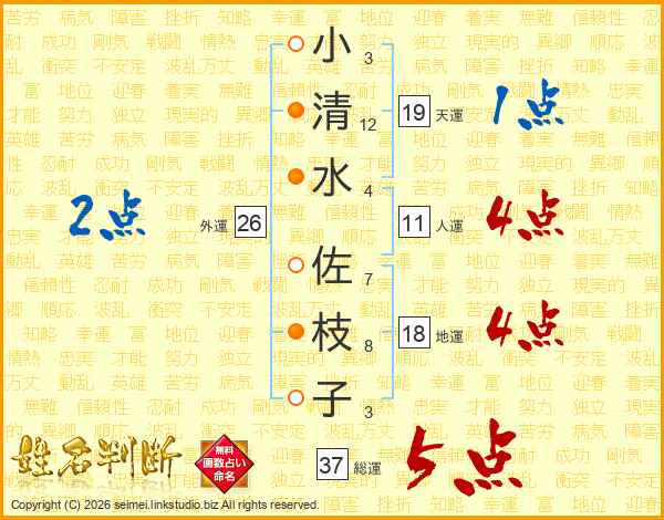 小(3画)清(12画)水(4画) 佐(7画)枝(8画)子(3画)