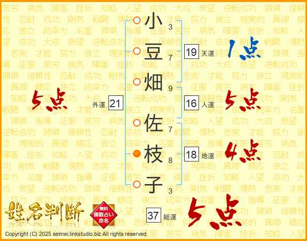 小(3画)豆(7画)畑(9画) 佐(7画)枝(8画)子(3画)