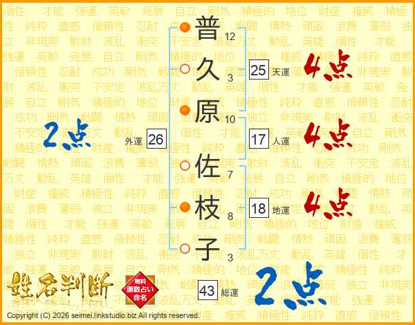 普(12画)久(3画)原(10画) 佐(7画)枝(8画)子(3画)