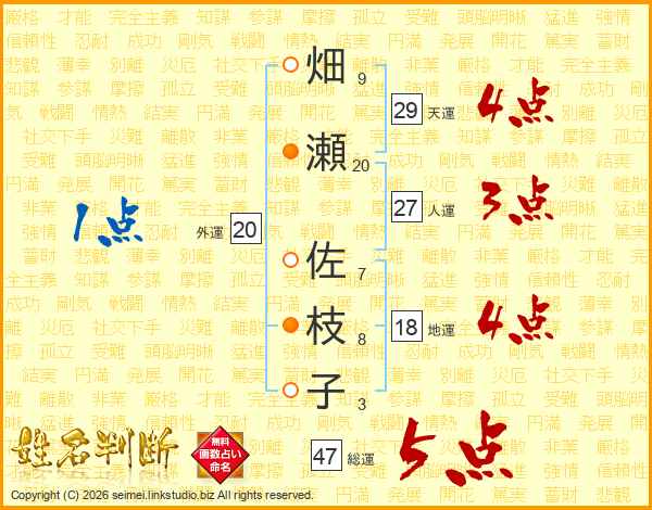 畑(9画)瀬(20画) 佐(7画)枝(8画)子(3画)