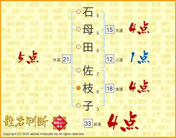 石(5画)母(5画)田(5画) 佐(7画)枝(8画)子(3画)