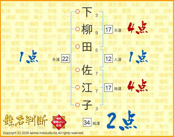 下(3画)柳(9画)田(5画) 佐(7画)江(7画)子(3画)