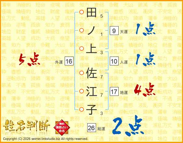 田(5画)ノ(1画)上(3画) 佐(7画)江(7画)子(3画)
