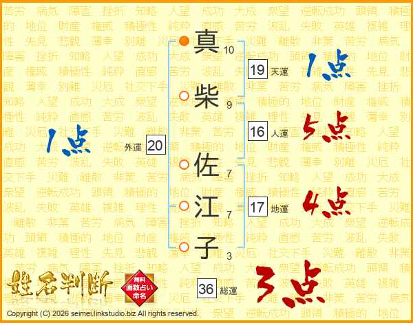 真(10画)柴(9画) 佐(7画)江(7画)子(3画)
