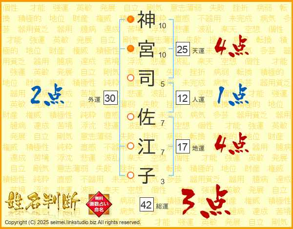 神(10画)宮(10画)司(5画) 佐(7画)江(7画)子(3画)